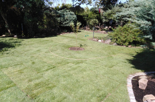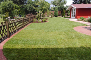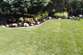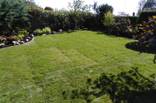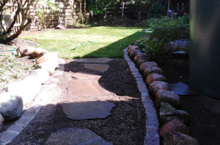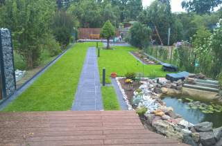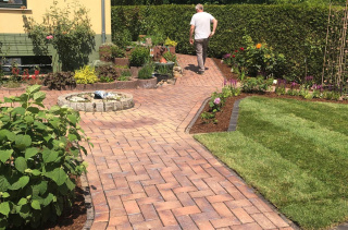 Gartenumgestaltung, Pflasterklinker, Rollrasen und Staudenpflanzung